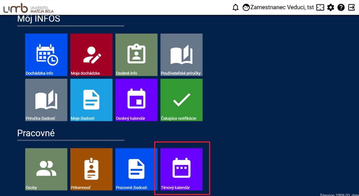 Každý vedúci pracovník má možnosť si prezerať svoj tím a ich žiadosti cez tímový kalendár. Tento kalendár sa nachádza po prihlásení sa do systému v časti „Pracovné“. Umiestnenie ikony/dlaždice záleží od prihláseného používateľa.