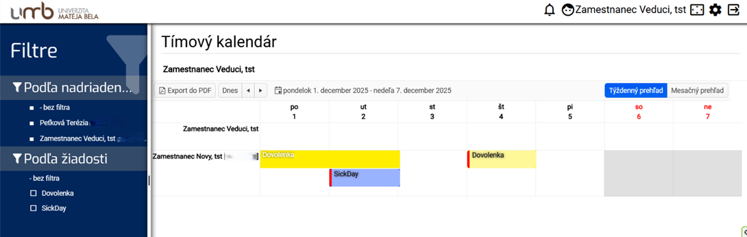 V časti „Filtre“ v ľavom menu, si môže používateľ filtrovať zobrazenie osôb podľa nadriadeného alebo podľa žiadosti. V „podľa nadriadeného“ sa zobrazujú osoby, ktorý sú vedúci pracovníci spojený s prihlásenou osobou tzn. jeho nadriadený a on ako vedúci. Ak sa zvolí možnosť „bez filtra“ tak sa v časti Tímový kalendár zobrazia všetky osoby v tíme vedúceho.