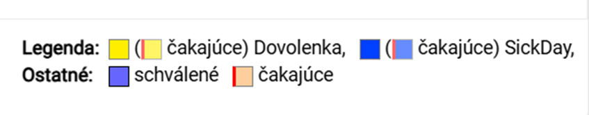 V „podľa žiadosti“ sa zobrazeným zamestnancom, zobrazia podané konkrétne žiadosti. Môžu sa filtrovať podľa napr. dovolenka, prípadne iné žiadosti. Ak sa zvolí bez filtra, zobrazia sa všetky ich žiadosti. Možnosť filtra je vždy len na podané žiadosti, tzn. ak v danom období nie je podaná žiadna žiadosť o dovolenku, informácia sa v tímovom kalendári nezobrazí a nie je možné podľa nej filtrovať zobrazenie. Žiadosti sú v kalendári rozdelené podľa farieb, ktoré sú vysvetlené v dolnej časti okna ako „Legenda“.