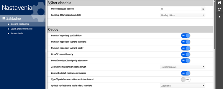 Cez ikonu nastavenia si užívateľ môže prispôsobiť základné osobné nastavenia, jazyk a zmeniť heslo. Všetky zmeny je potrebné uložiť cez ikonu diskety.