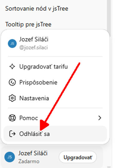 2. Ak ste v aplikácii prihlásený svojim súkromným kontom odhláste sa kliknutím na svoje meno v ľavom dolnom rohu obrazovky a následne na položku „Odhlásiť sa“ a potvrďte odhlásenie v okienku, ktoré sa zobrazí: