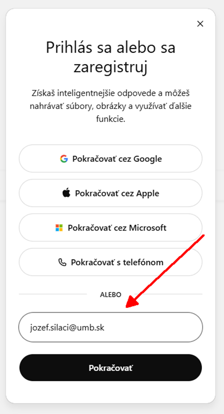4. Po kliknutí sa zobrazí okienko s rôznymi možnosťami prihlásenia. Neklikajte na žiadnu z predvolených metód a do poľa v spodnej časti okienka zadajte svoju školskú mailovú adresu a kliknite na tlačidlo „Pokračovať“: