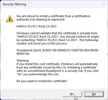 Upozorňujeme že pri novej inštalácií, Vás inštalátor môže vyzvať na potvrdenie tabuľky s názvom Security Warning, kde je potrebné si skontrolovať že sa jedná o certifikát HARICA TLS ECC Root CA 2021 a v tej tabuľke je taktiež potrebné odkliknúť ikonu Yes, podľa priloženého obrázku nižšie.