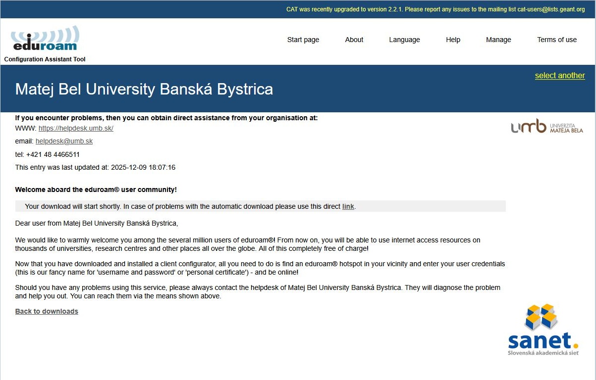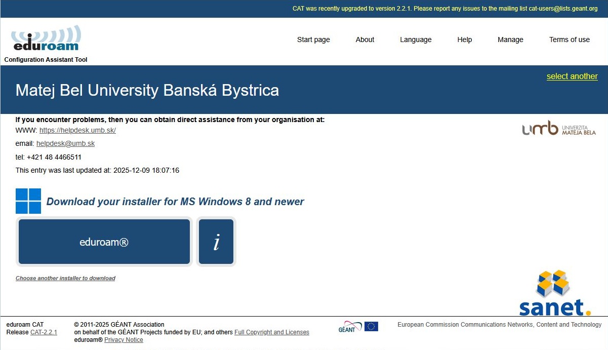 3. Budete presmerovaní na stránku, ktorá obsahuje odkaz na inštalačný súbor (installer) pre operačný systém zariadenia, z ktorého pristupujete na web eduroam CAT.