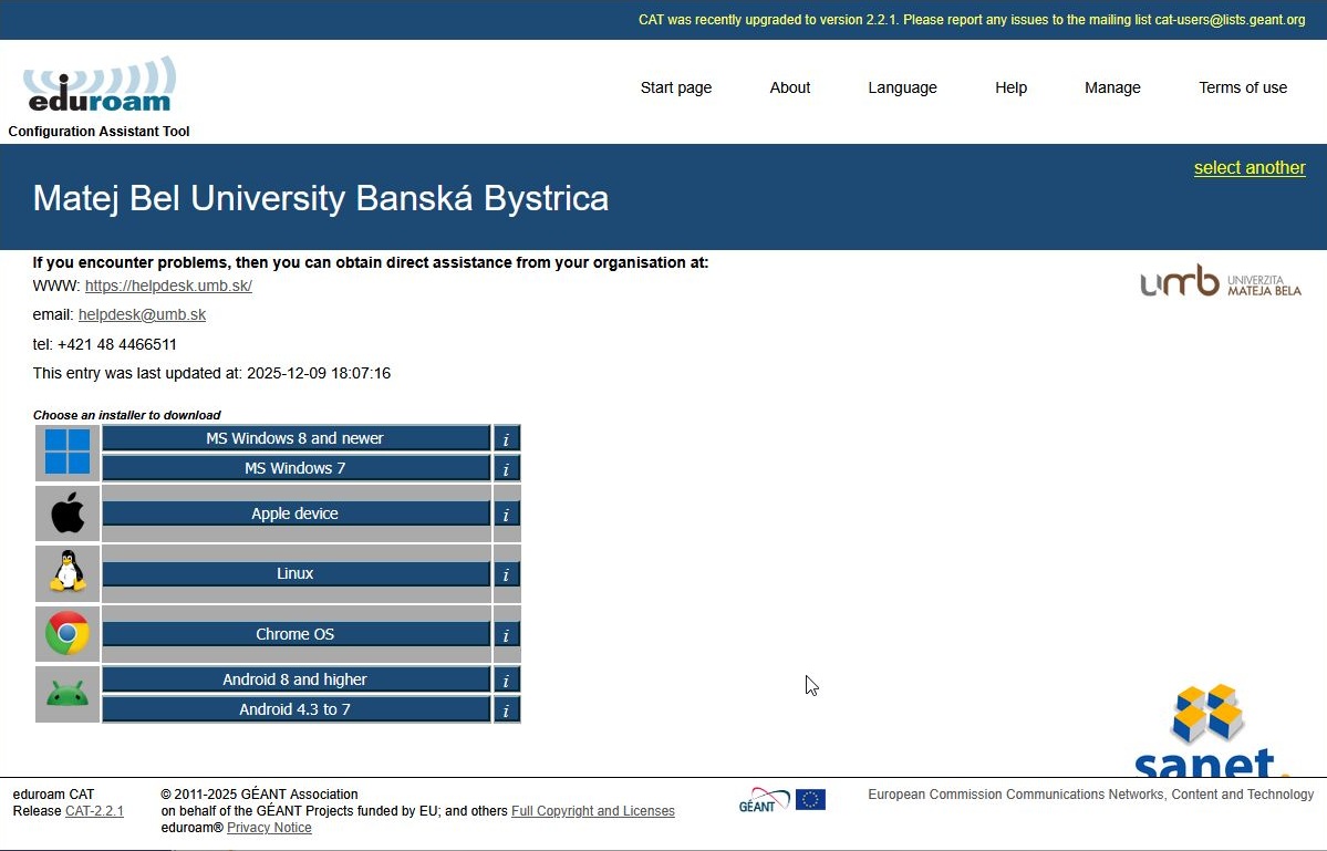 Ak webová aplikácia nerozpozná automaticky operačný systém zariadenia, z ktorého pristupujete na web eduroam CAT, alebo potrebujete stiahnuť inštalačný súbor pre iné zariadenie, môžete si vybrať z ponuky inštalačných programov pre rozličné OS kliknutím na možnosť: Choose another installer to download. Budete presmerovaní na stránku, ktorá obsahuje odkazy na inštalačný súbor (installer) pre všetky momentálne dostupné platformy OS: